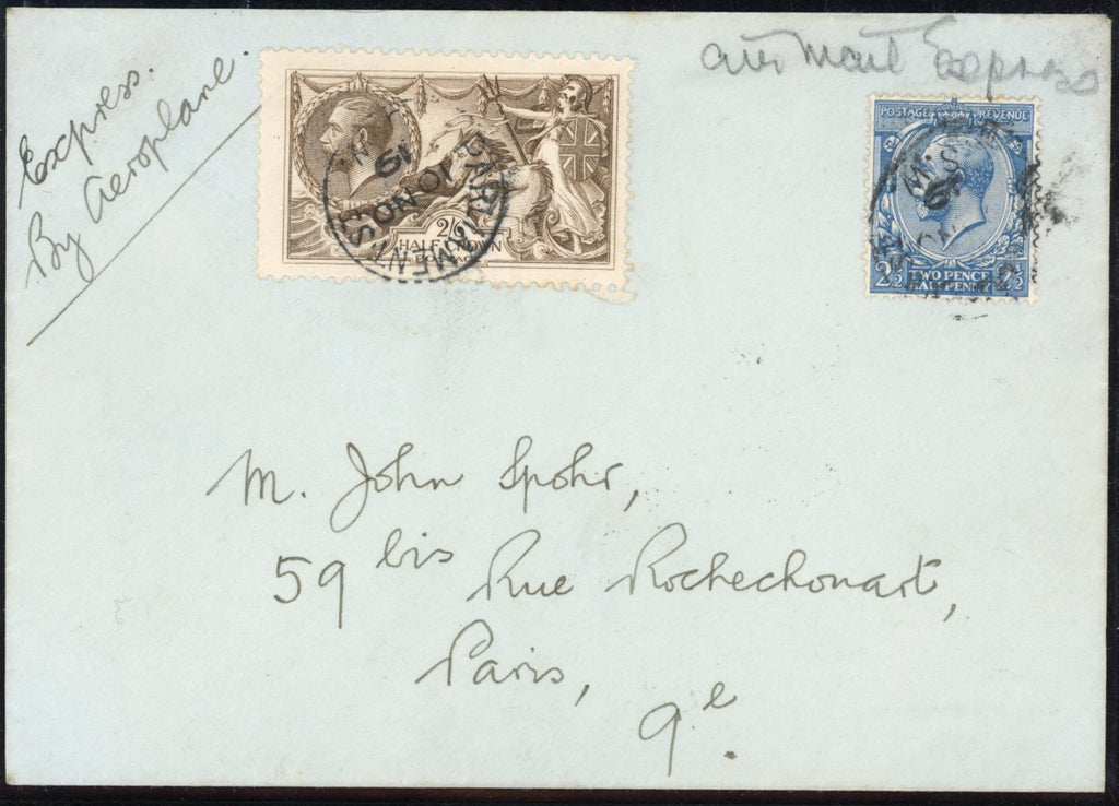 A superb example flown at the 2s 8½d per ½oz rate pre-paid with a 2½d blue and a 2s6d olive-brown both tied by Parliament St. circular date stamps for 'NO.10.1919'.