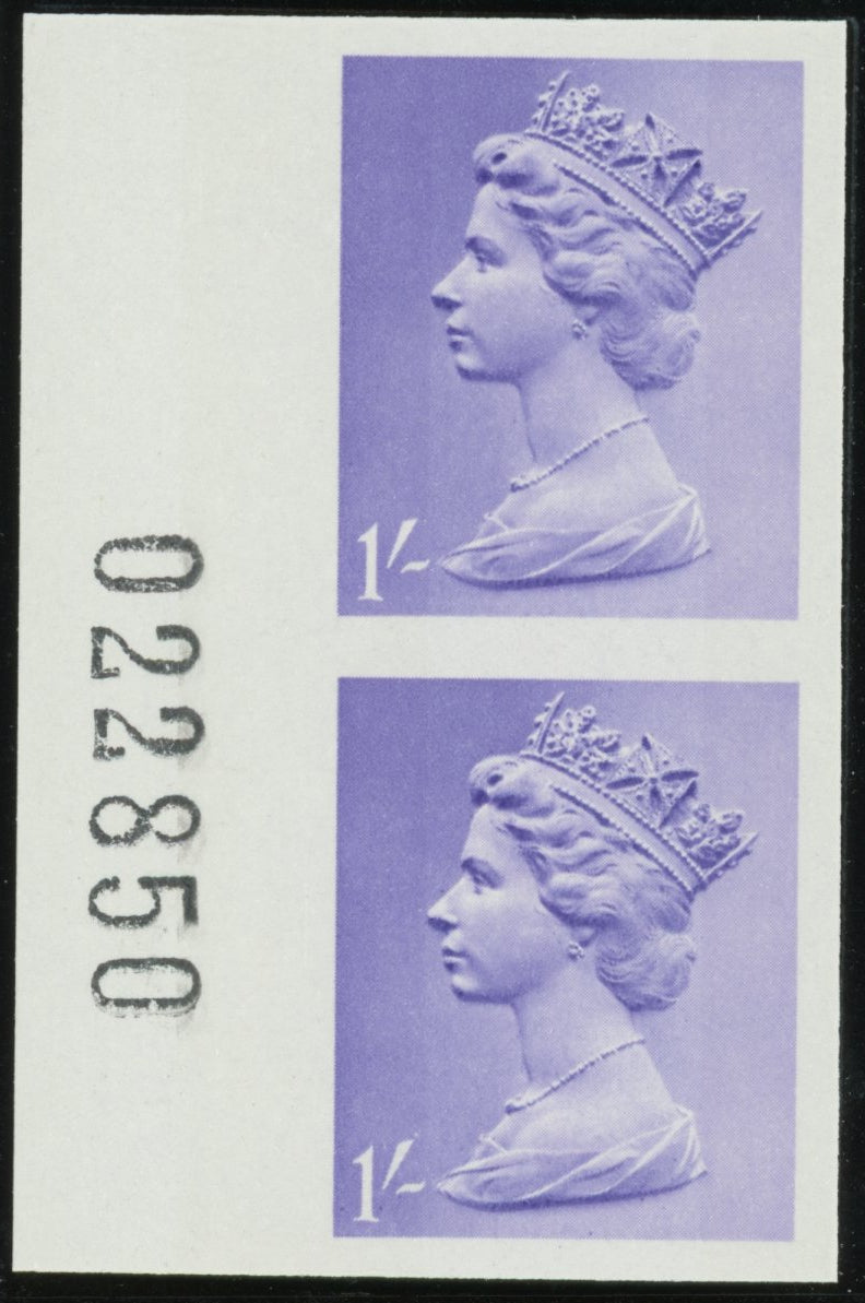 A superb unmounted mint left-hand marginal vertical pair of the 1967 1s light bluish violet (with two phosphor bands), in imperforate imprimatur format. Each stamp bears a discreet “BPMA” handstamp on reverse, confirming official imprimatur status.