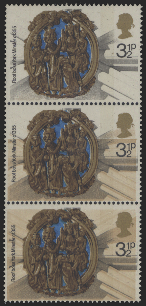 The stamp depicts "The Adoration of the Magi", taken from the roof boss (the centre of the vaulting ribs) in the nave of York Minster. The boss is dated about 1355. The colours used on the stamp were stone, light grey, blue, gold, brown and black.