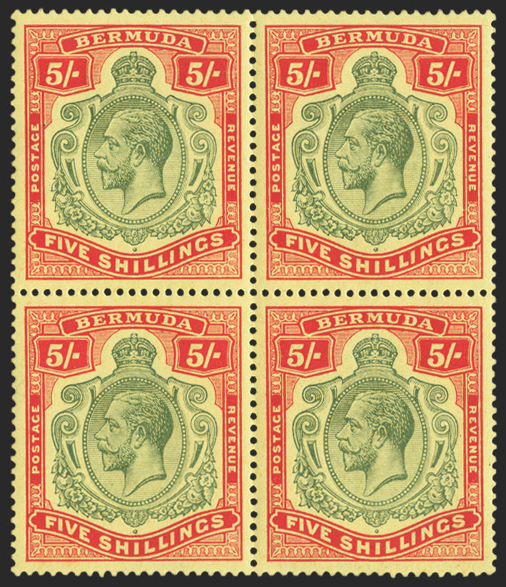 Bermuda 1918-22 5s green and carmine-red/pale yellow, watermark MCA, third printing (1921), SG53d.