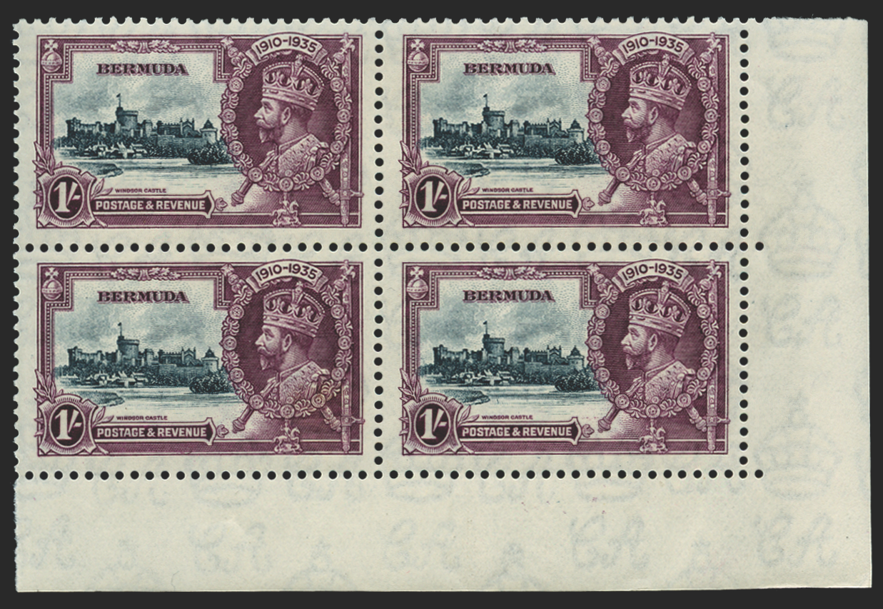 Bermuda 1935 Silver Jubilee 1s slate and purple, lower right corner block of 4 from vignette plate "2A", R10/6 showing variety "Kite and vertical log", SG97k.