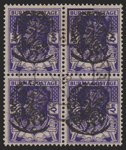 Japanese Occupation of Burma 1942 (May) King George VI 3p bright violet, type 2 peacock of Myaungmya, block of 4, centrally cancelled by "KYONPYAW" circular date stamps, SGJ12.