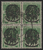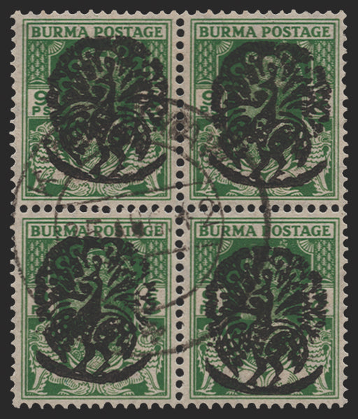 Japanese Occupation of Burma 1942 (May) 9p yellow-green, type 2 peacock of Myaungmya, block of 4, centrally cancelled by "KYONPYAW" circular date stamp, dated "25 AUG 42", SGJ14.