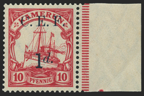 Cameroon Expeditionary Force 1915 1d on 10pf carmine, right marginal, SURCHARGE TRIPLE, TWO ALBINO, SGB3d.