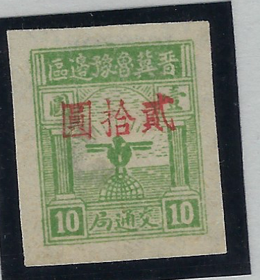 China People's Republic Regular Issues North China Shaanxi-Hebei-Shandong-Henan Border Area 1946-47 $20 on 10 jiao($1) bright green, SGNC111