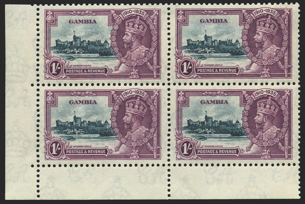Gambia 1935 Silver Jubilee 1s slate and purple, lower left corner block of 4 from vignette plate "1", showing variety "Extra flagstaff" on R9/1, SG146/a.
