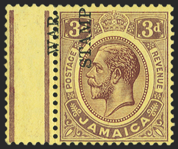 Jamaica 1917 (March) 3d purple/yellow, type 21 'WAR/STAMP.' overprint. Error with overprint SIDEWAYS (reading up), SG75d.