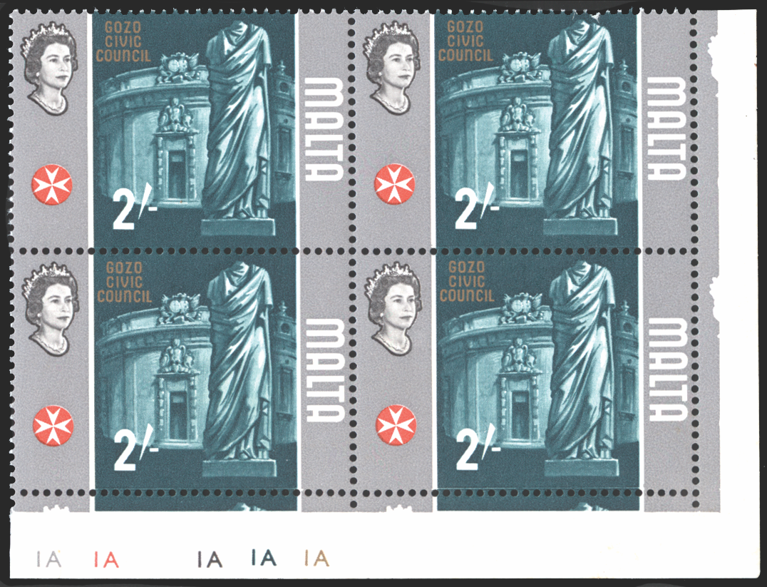 Malta 1965-70 2s 'Gozo Civic Council', error GOLD (FRAME) OMITTED, lower right corner block of 4 with '1A' (x5) plate numbers confirming the missing colour, SG343b.