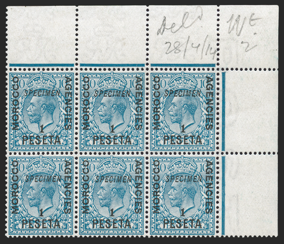 Morocco Agencies 1914-26 Spanish Currency 1p on 10d turquoise-blue, watermark Simple Cypher, overprinted 'SPECIMEN' (type GB23), upper right corner block of 6 (3x2) annotated 'Deld 28/4/14 Wt. 2' in pencil, SG135.