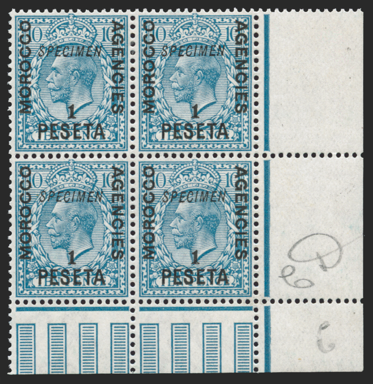 Morocco Agencies 1914-26 Spanish Currency 1p on 10d turquoise-blue, watermark Simple Cypher, overprinted 'SPECIMEN' (type GB23), lower right corner block of 4 from upper pane initialled 'CD' in pencil, SG135.