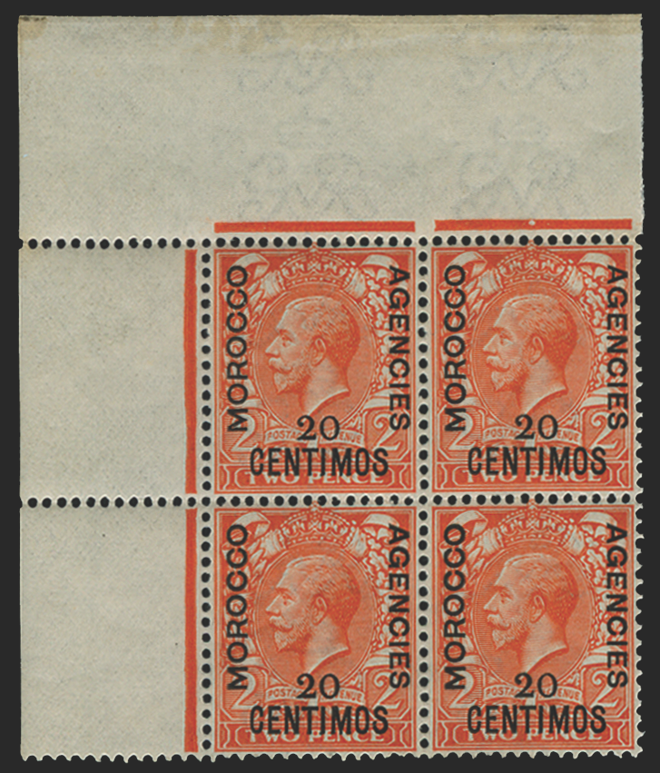 Morocco Agencies 1914-26 Spanish Currency 20c on 2d orange, watermark Simple Cypher, showing 'surcharge double one albino', upper left corner block of 4, SG132a.