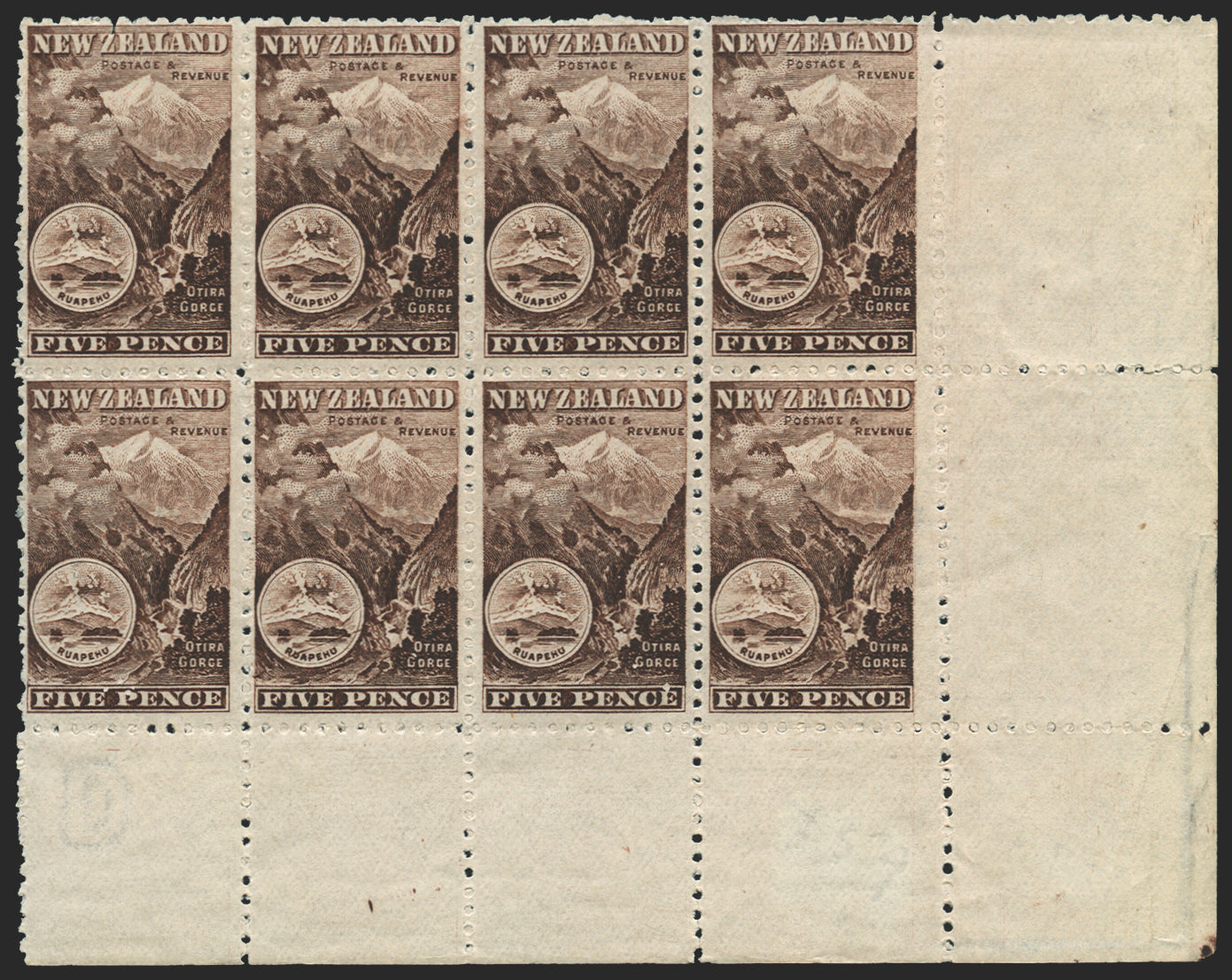 New Zealand 1902-07 5d deep brown, watermark 43 sideways (to right from back, and reversed), perforations 11, lower right corner block of 8 (4x2) from R9/10/9-12, SG311a var.