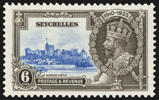 Seychelles 1935 Silver Jubilee 6c ultramarine and grey-black, showing variety 'Double flagstaff' from vignette plate '6', R5/2, SG128e.
