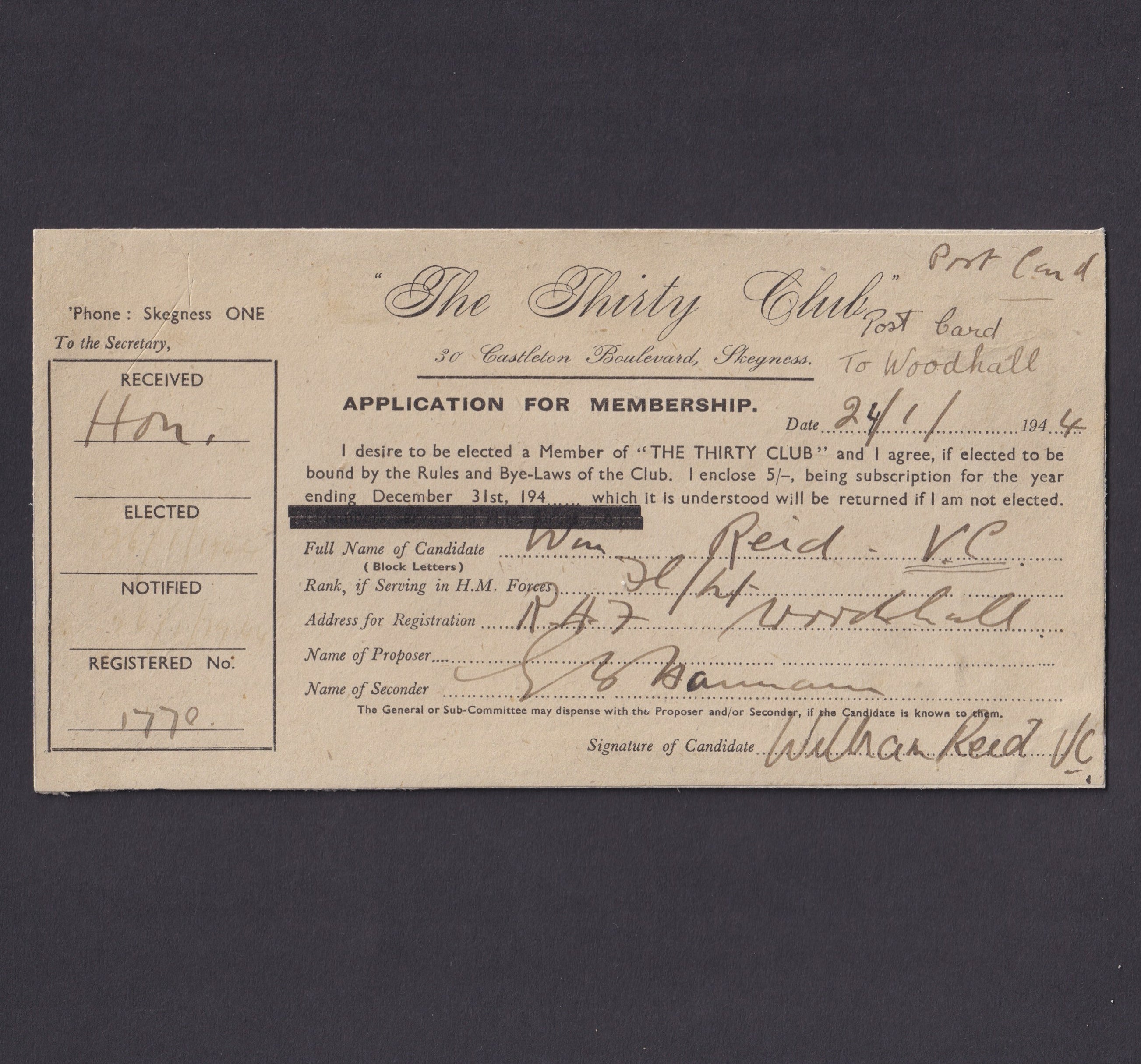 It is a rectangular, printed membership application card for The Thirty Club at 30 Castleton Boulevard, Skegness. It is dated January 24, 1944 and records Reid’s rank as “Ft/Lt” (Flight Lieutenant), and his address as RAF Woodhall. It is signed “William Reid VC”. Reid signs that he is paying the 5 shillings membership fee for the year.