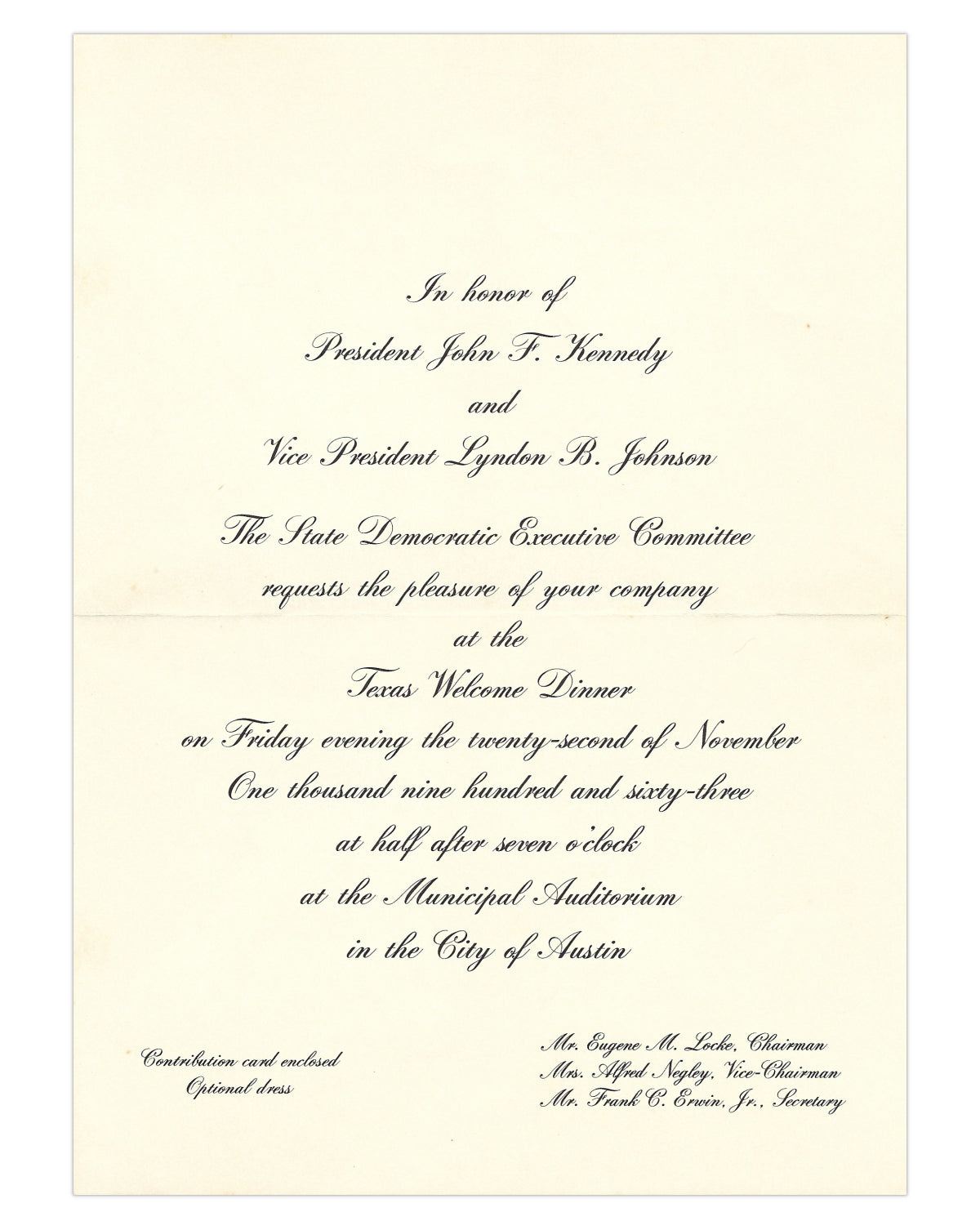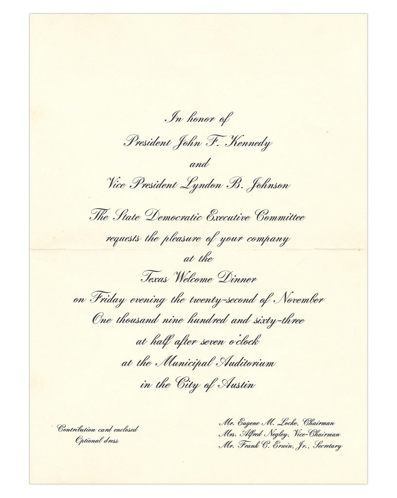 ''In honor of President John F. Kennedy and Vice President Lyndon B. Johnson The State Democratic Executive Committee requests the pleasure of your company at the Texas Welcome Dinner on Friday evening the twenty-second of November One thousand nine hundred and sixty-three at half after seven o'clock at the Municipal Auditorium in the City of Austin''.
