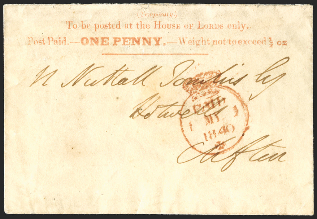 When the Uniform Penny Postage was introduced on 10 January 1840, the free franking privileges of Members of Parliament were abolished. During the same month, these special envelopes were created for mail posted from the Houses of Parliament and remained in use until the introduction of stamps and the Mulready stationery on 6th May, 1840.