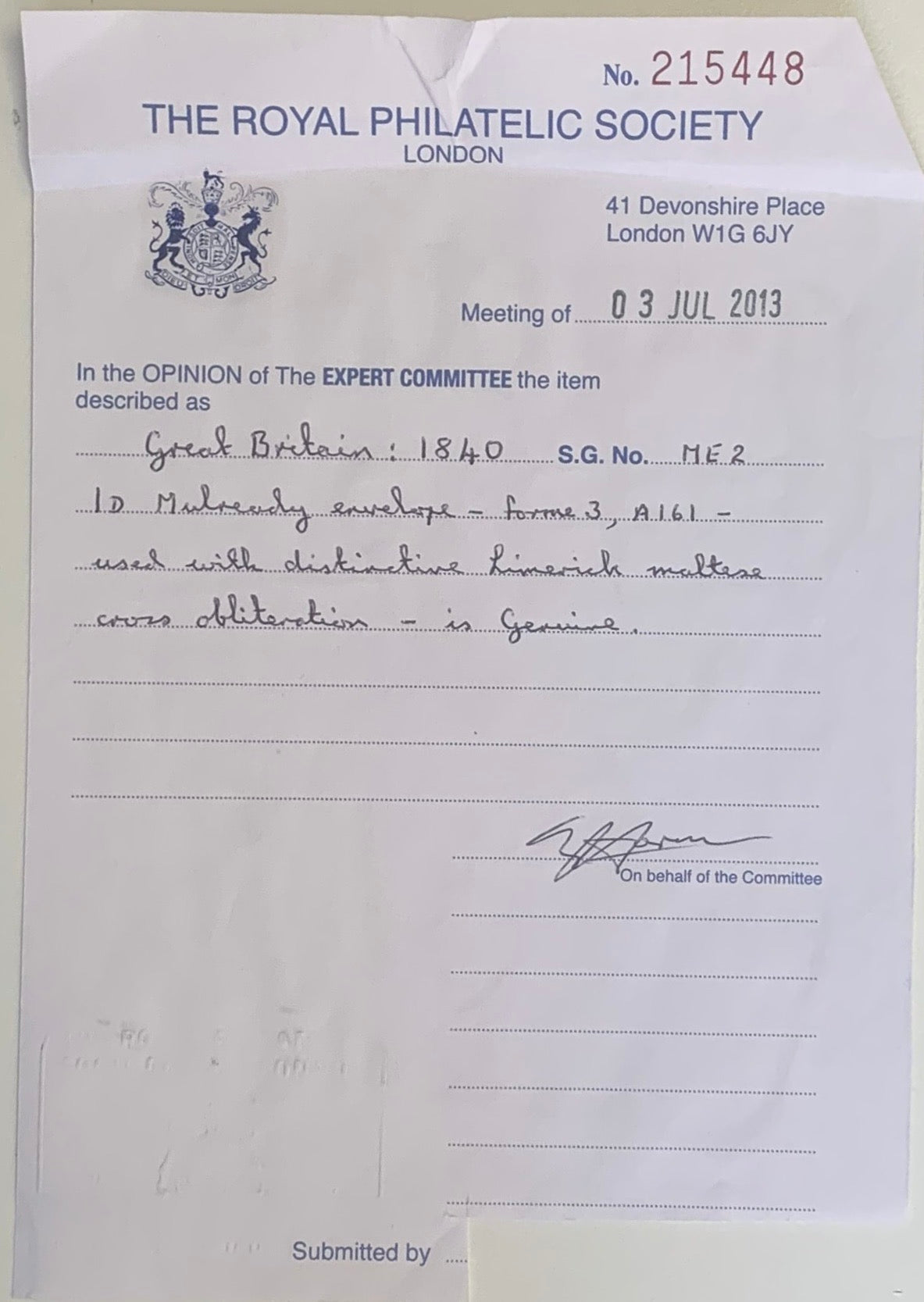 Accompanied with a 2013 Royal Philatelic Society (RPS) Certificate of Authenticity.