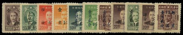 China 1949 (12 May) Yunnan province silver yuan surcharges, set of 11 to $1.20 on $100,000 sage-green, including 4c on $20 and 12c on $200 chocolate with values in normal Chinese currency. A fine unused rare set without gum as issued. The last two stamps, in particular, are very scarce. SG1333/43.