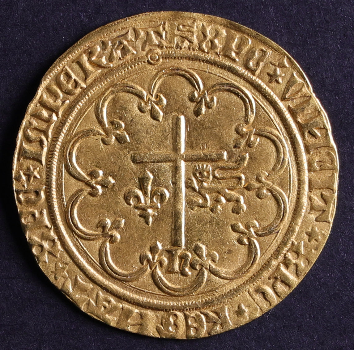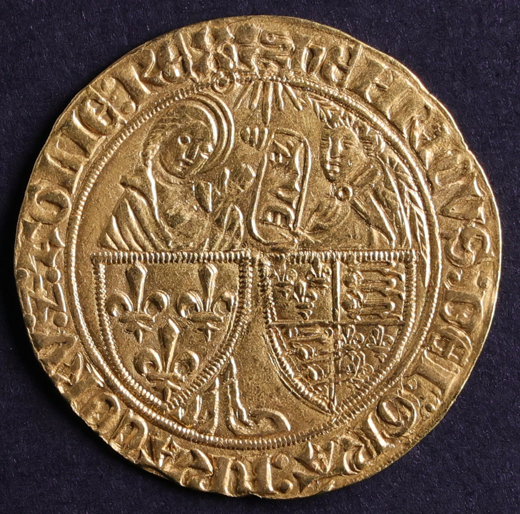 From 1421, the kings of France Charles VI and Charles VII had a new type of gold coin struck: the golden "salut". Their rivals, the kings of England Henry V then his son Henry VI, hastened to copy the golden "salut" to make use of it, in particular in their French possessions, using the graphics of the French currency but with some specific modifications.