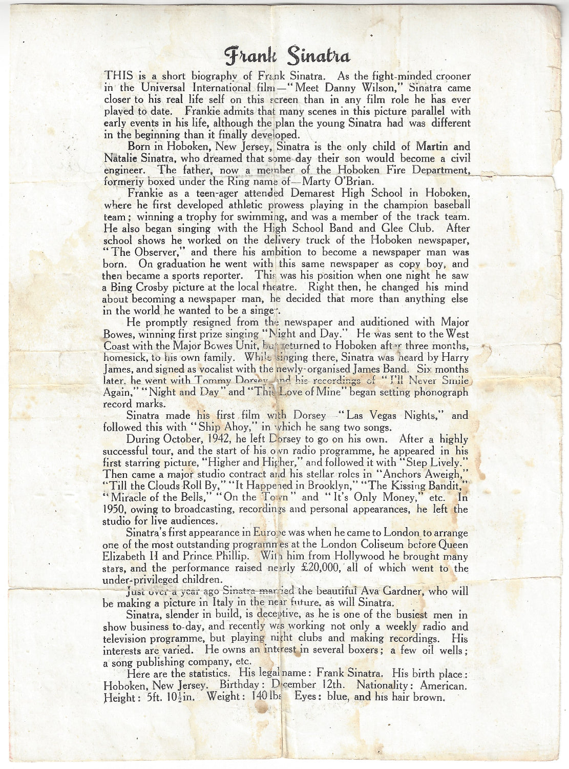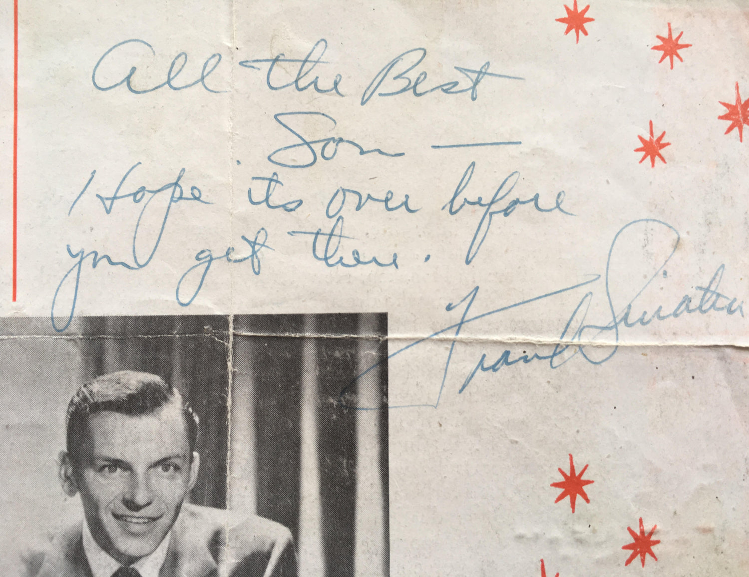 The venue’s entertainment manager acquired the signature from Sinatra backstage in his dressing room. He explained to Sinatra that his son, who was in the British Army, would shortly be leaving for the Korean War. Upon hearing this, Sinatra wrote: “All the Best Son – Hope it’s over before you get there. Frank Sinatra”.