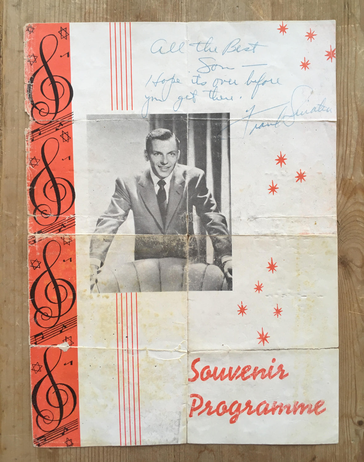 After receiving the programme, the manager’s son folded it and put it in the top pocket of his army uniform and carried it to Korea, where Sinatra’s words came true. The war was over by the time he arrived.