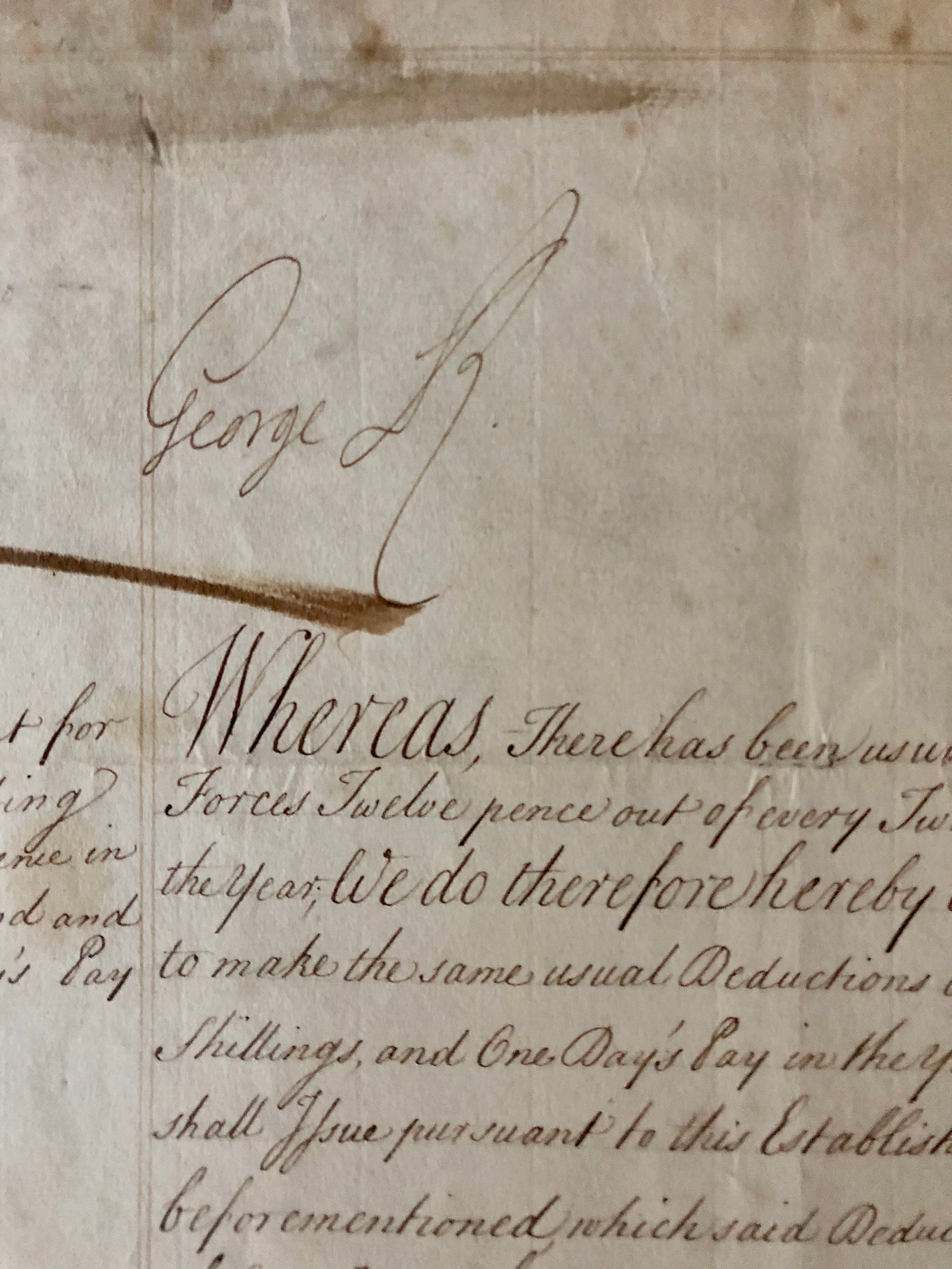 George II signs the document handsomely “George R” in black ink at the court at Windsor Castle on July 2, 1730.