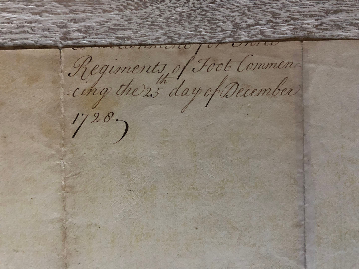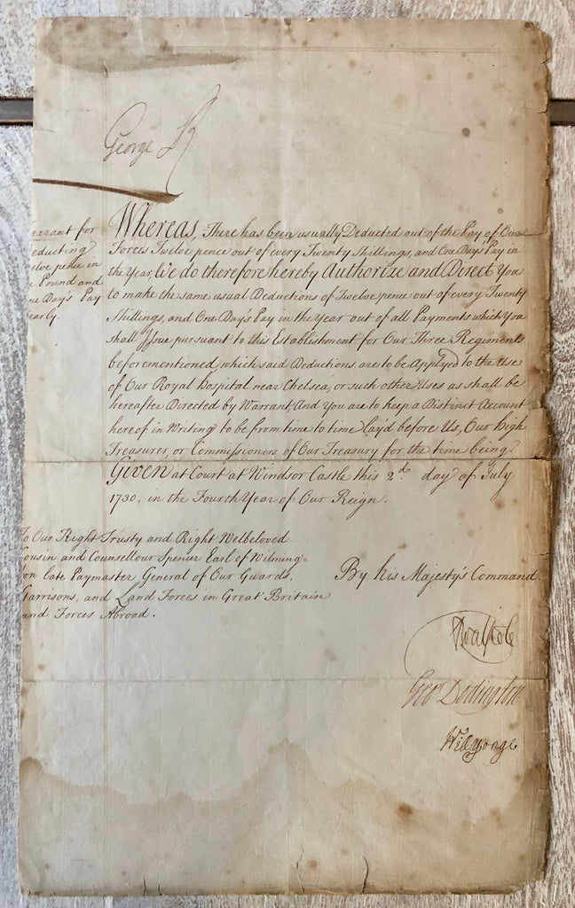 The document is a warrant to the future Prime Minister Spencer Compton in his role as late Paymaster General of the Guards, Garrisons, and Land Forces. The warrant states that three regiments should be deducted 12 pence of every 20 shillings, and one day's pay per year. The funds to be used by the Royal Hospital in Chelsea.