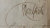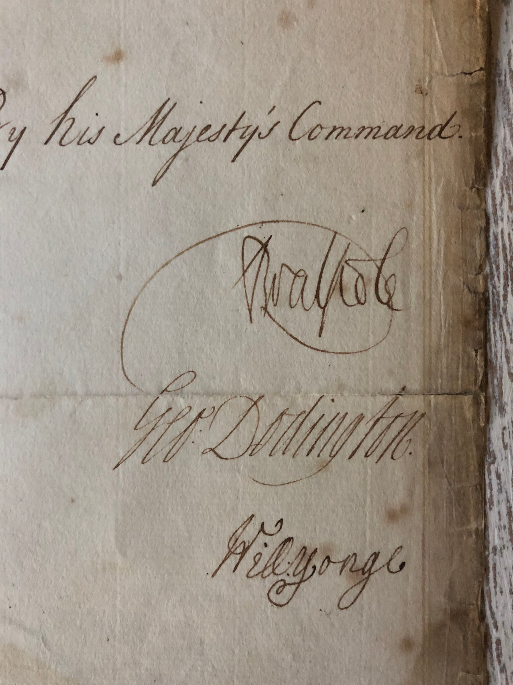 Countersigned flamboyantly in black ink at the foot by Robert Walpole, and politicians George Dodington and William Yonge.