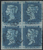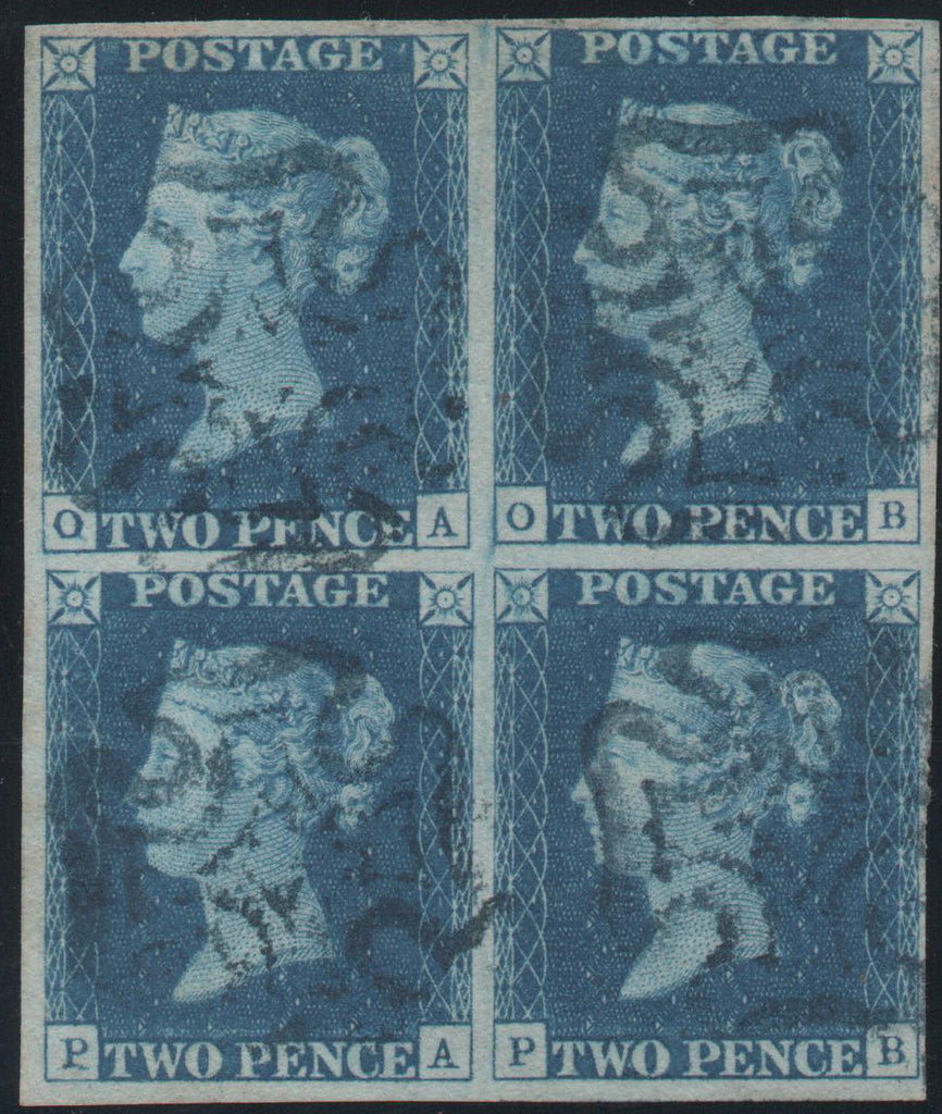 Great Britain 1840 2d. Blue from Plate 2. Block of 4 lettered OA, OB, PA, PB, cancelled by Maltese Cross in Blue. A beautiful piece being the only block of four 2d blues cancelled by a blue Maltese Cross in existence, unique as such. Accompanied by certificate of authenticity from the Royal Philatelic Society.
