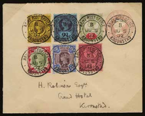 Very fine 1d pink postal stationery envelope uprated with an additional 2d, 2½d, 3d, 6d, 9d and 1s green & carmine from the 1887-1900 "Jubilee" issue all beautifully tied by crisp upright Army Post Office/Roonstad circular date stamps for JU.5.1902.