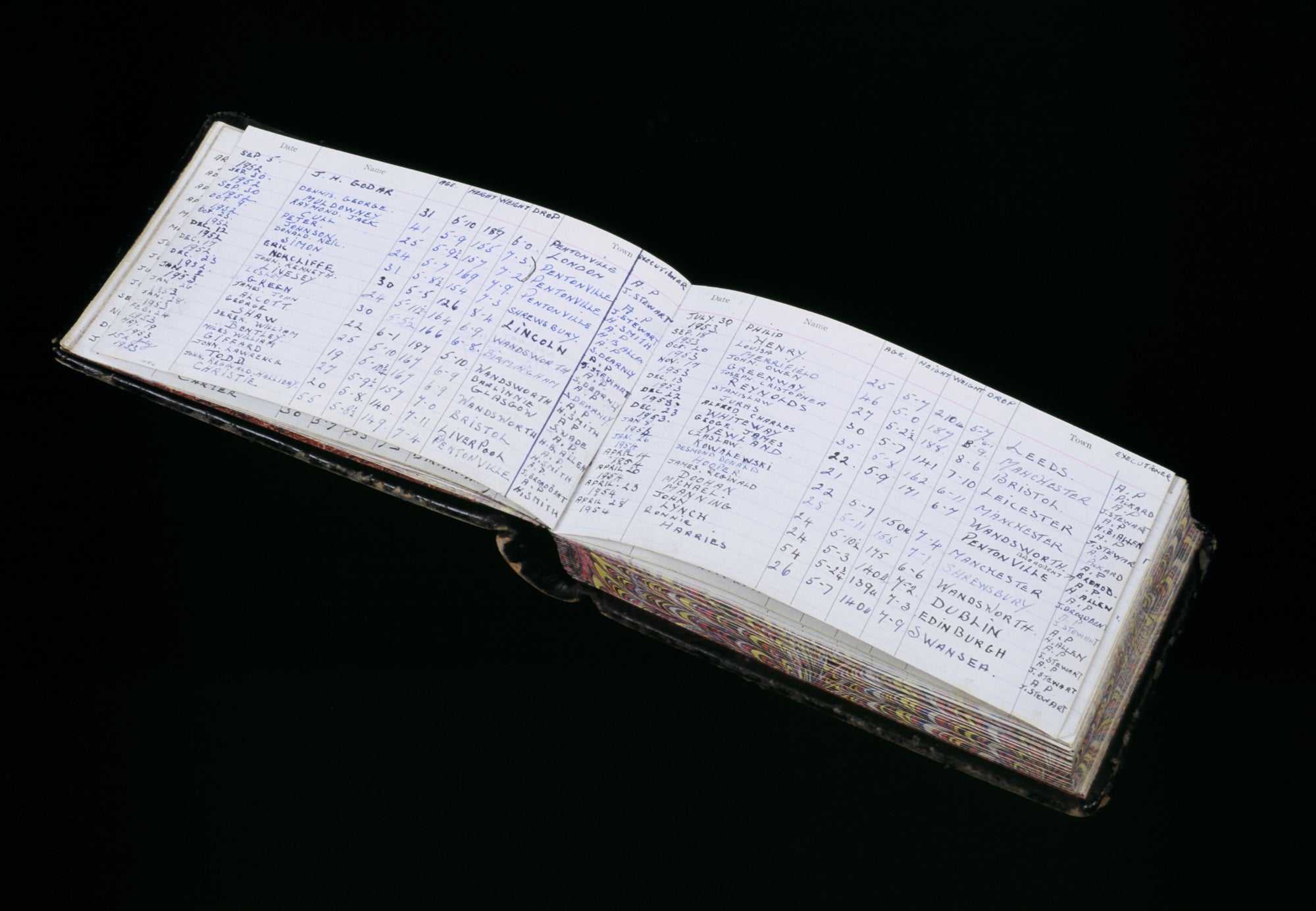 Henry Pierrepoint's execution book, 6.75 by 4.5 inches. It includes personal details of those he hanged from 1 November 1901 to 14 July 1910. The sites of the executions and the prisoner's name, age, height and weight are included, as are remarks on the physical frame of the prisoners and calibre of their necks. For example: "very heavy body, ordinary neck"; "wirey, very thin neck"; "strong neck, little flabby". Henry used these to calculate the required length of rope and distance of "drop" to break the prisoner’s neck instantly. The "drop" is meticulously recorded for each.