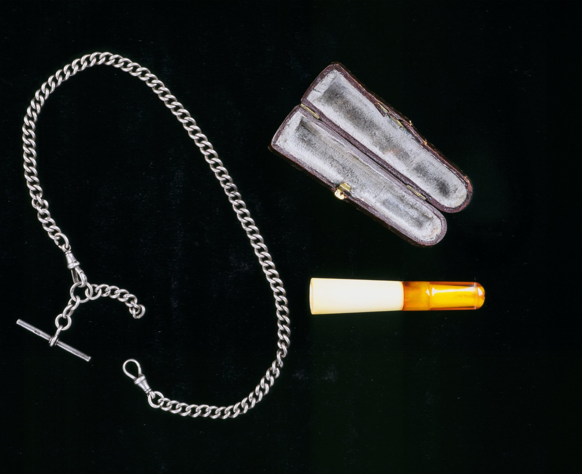 Henry Pierrepoint’s amber and ivory cigar holder. 3.2 inches in length, it comes with its original leather, silver and velvet-lined case, measuring 3.5 inches.