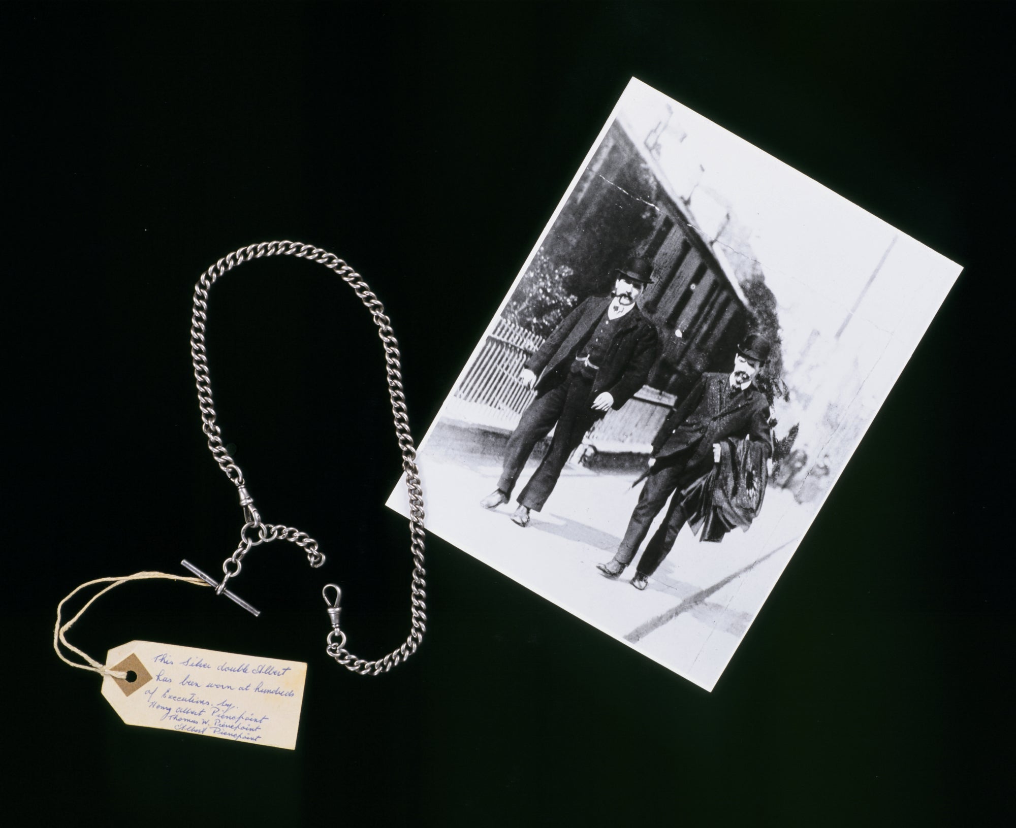 A fine silver watch chain worn by Albert, Henry and Thomas at hundreds of executions between 1901 and 1956. It measures 17 inches in length, including the silver bar. Using this chain, the Pierrepoints counted the last minutes of the condemned before the cell doors opened, and the words, “it’s time”, were uttered.