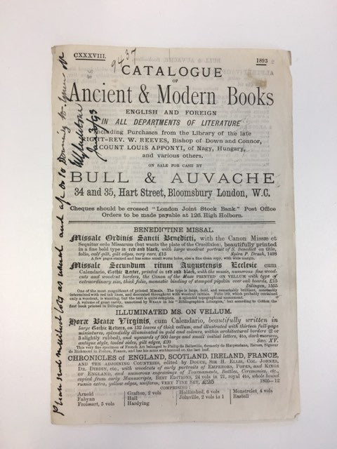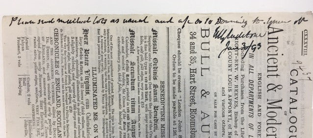 This is the front page (8.5 x 5.5 inch) of an auction catalogue dated January 30, 1893 – Gladstone’s final year as Prime Minister. Along the left hand margin Gladstsone has written “Please send … lots as usual and c.o. 10 Downing St.”