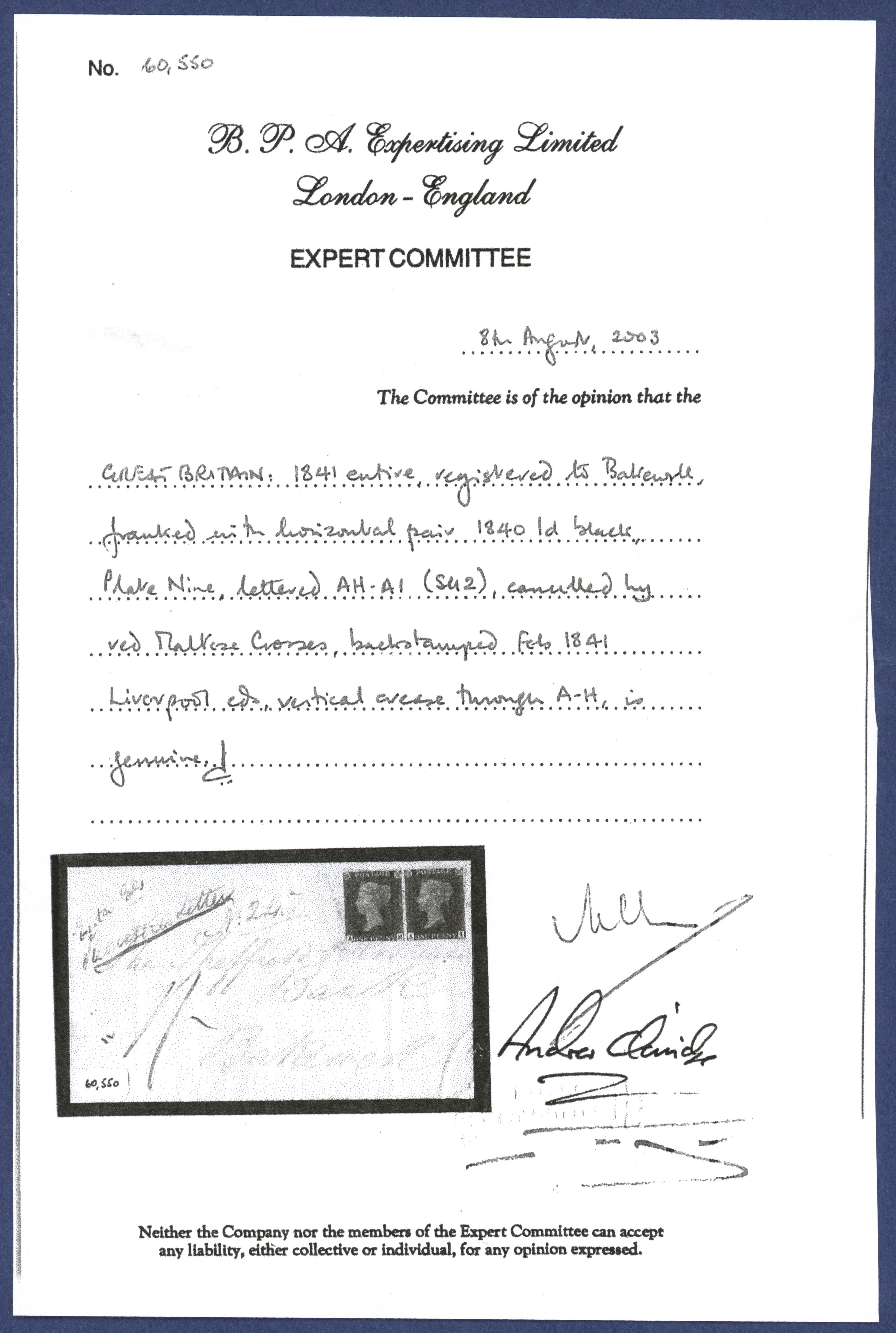 Accompanied with a British Philatelic Association (BPA) certificate of authenticity (2003).