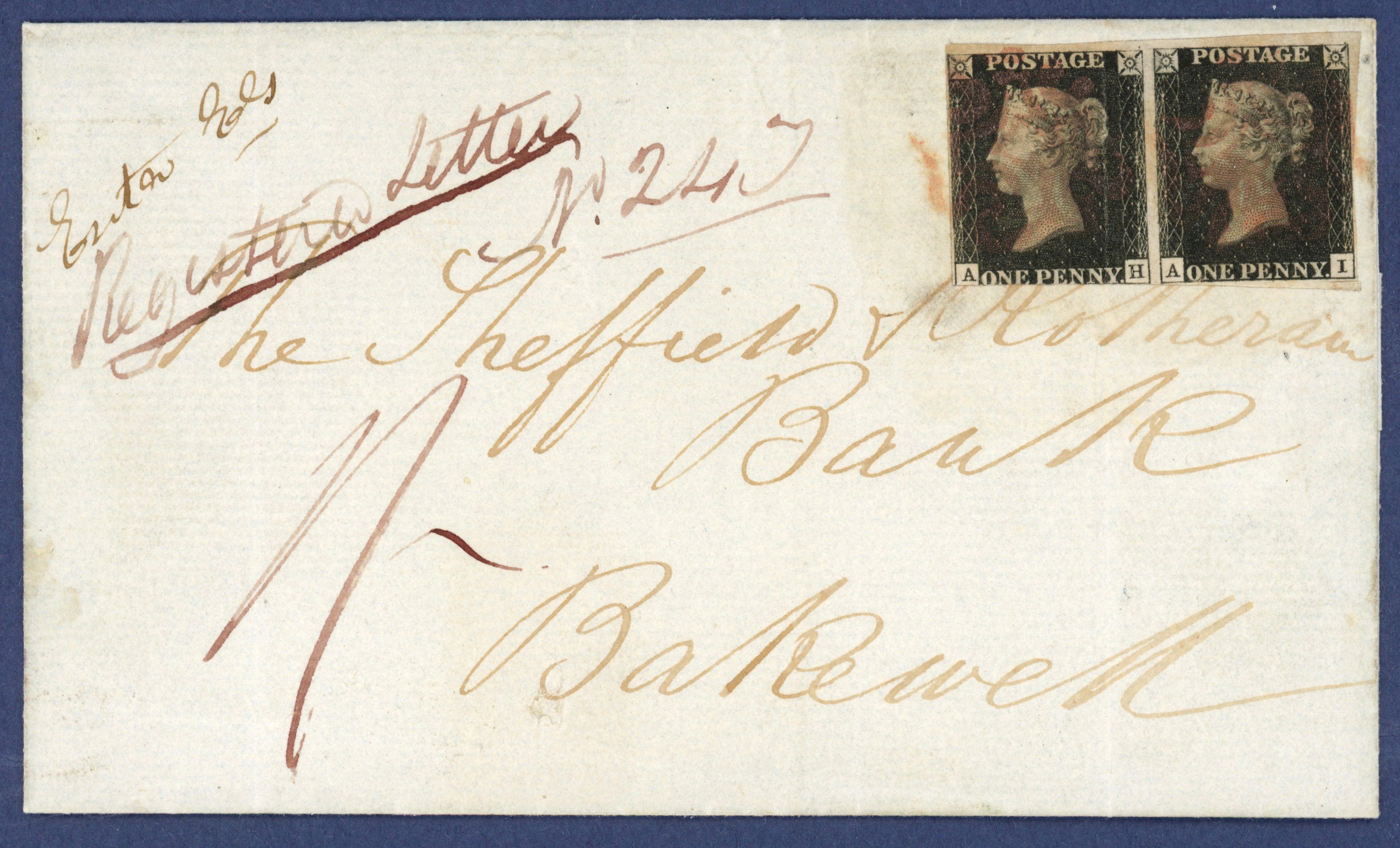 An important and early registered letter and unique as the only known multiple of the Penny Black on registered mail. One other Registered cover exists with four single 1d blacks.