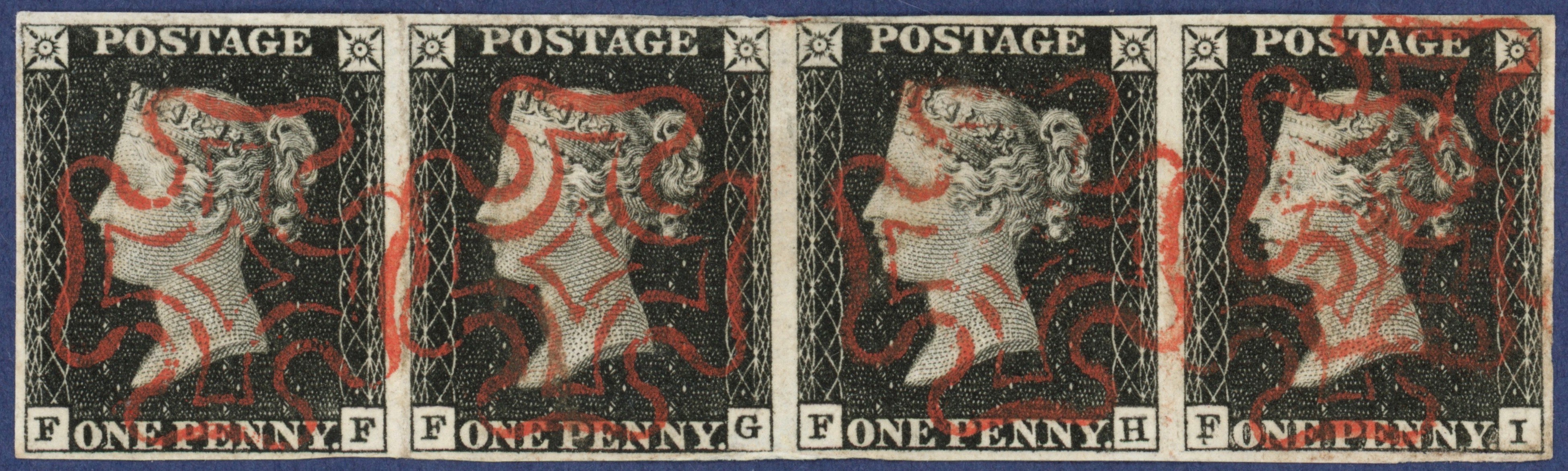 A fine and beautiful four margin strip attractively cancelled with the red Maltese Cross. An outstanding penny black multiple and extremely fine as rare in this quality.