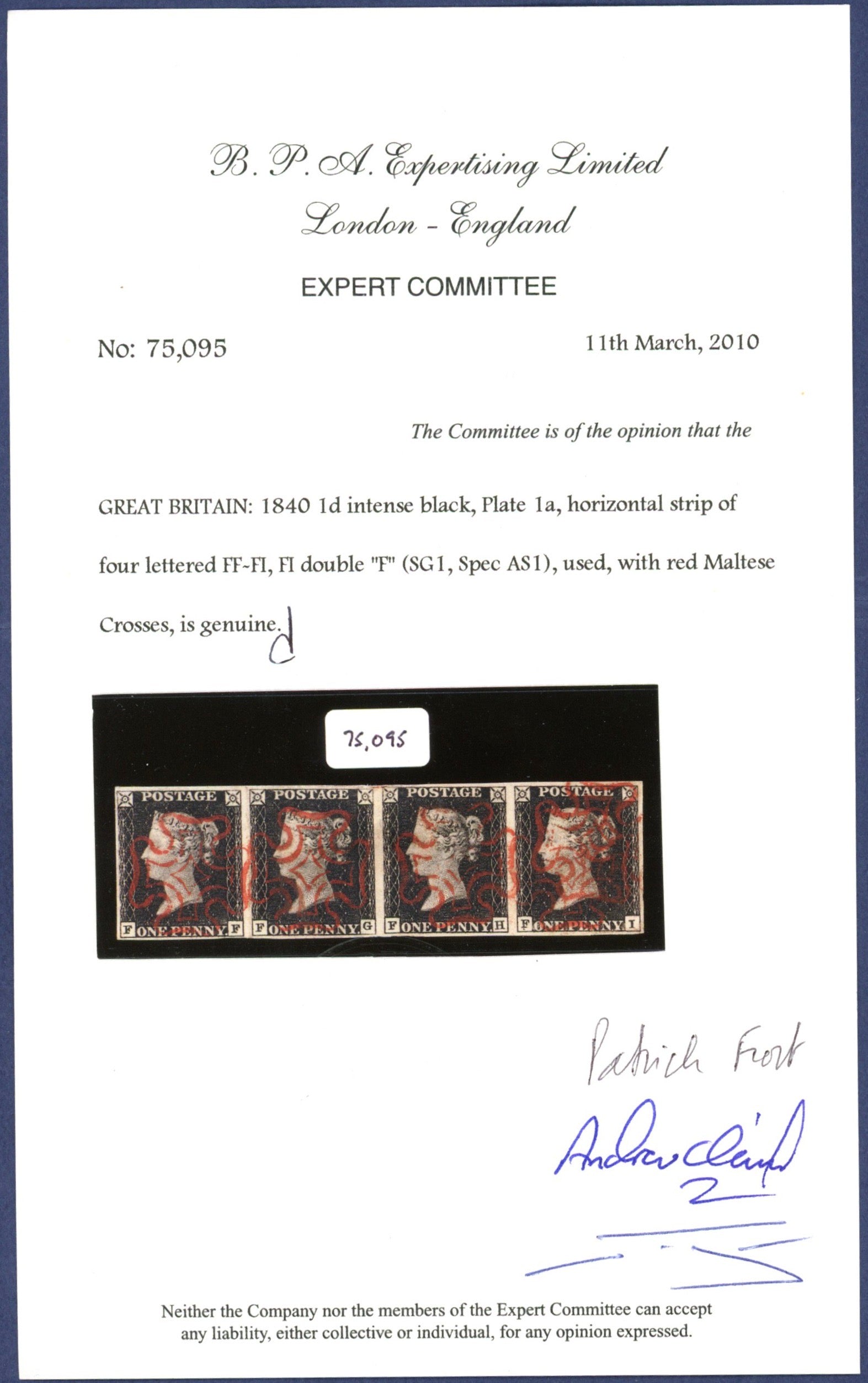 Great Britain 1840 1d intense black, plate 1a, horizontal strip of four with four margins lettered 'FF-FI', showing plate flaw double 'F', cancelled by four fine strikes of red Maltese Crosses, SG1.