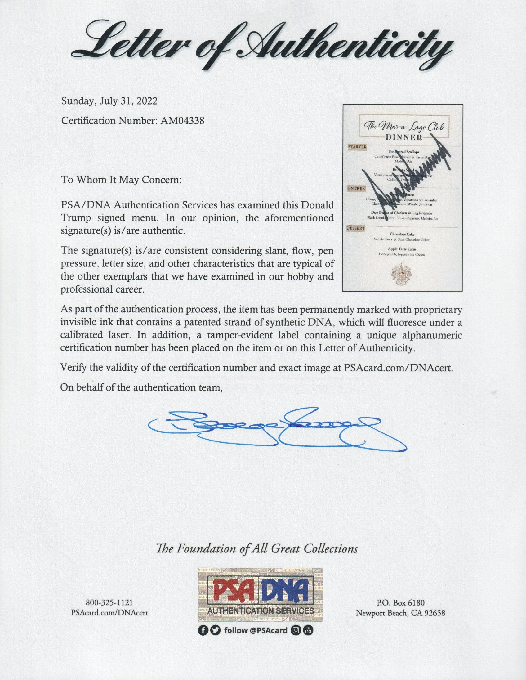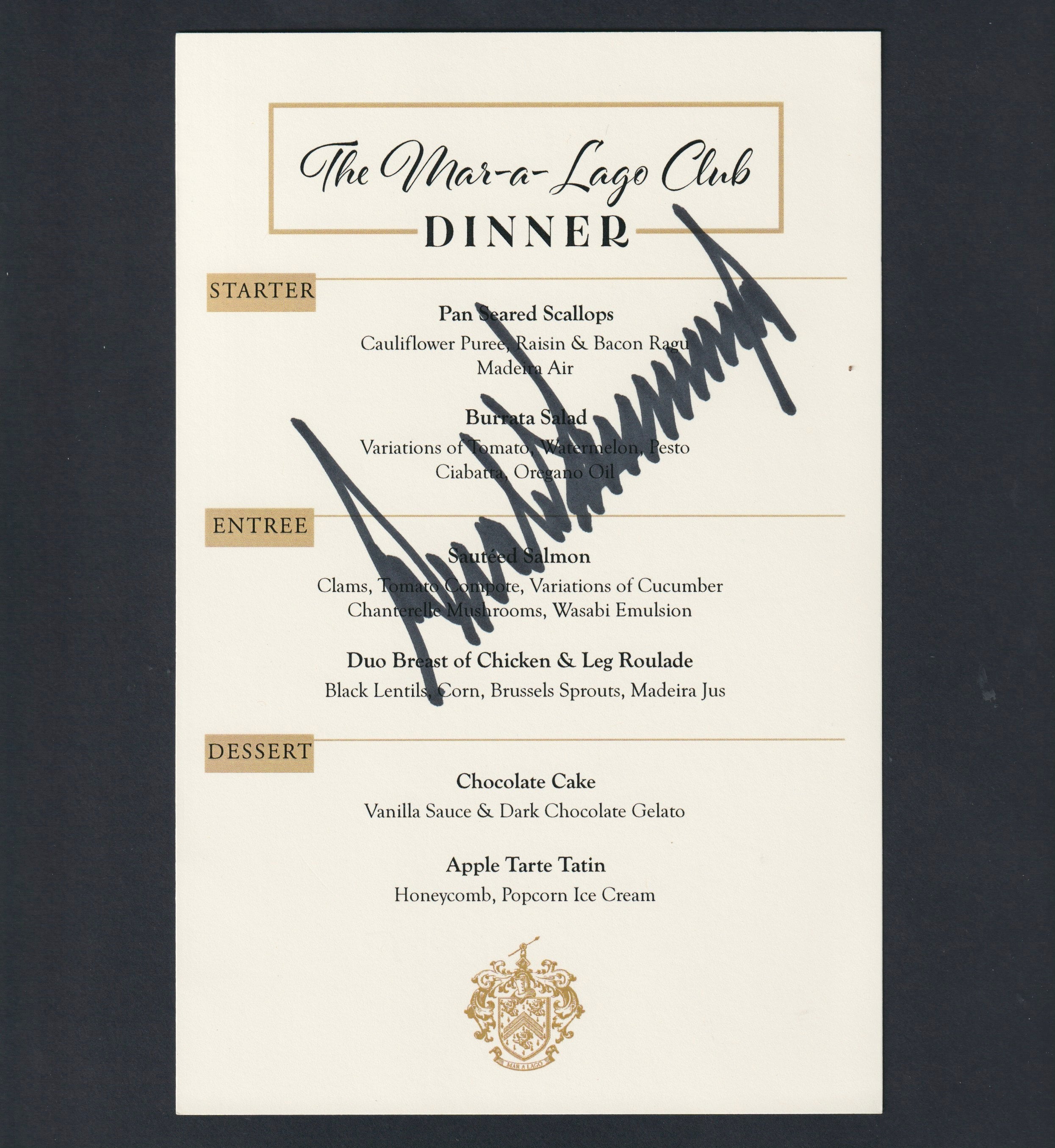 Donald Trump's signature on a Mar-a-Lago menu: a unique and characteristic Donald Trump artefact.