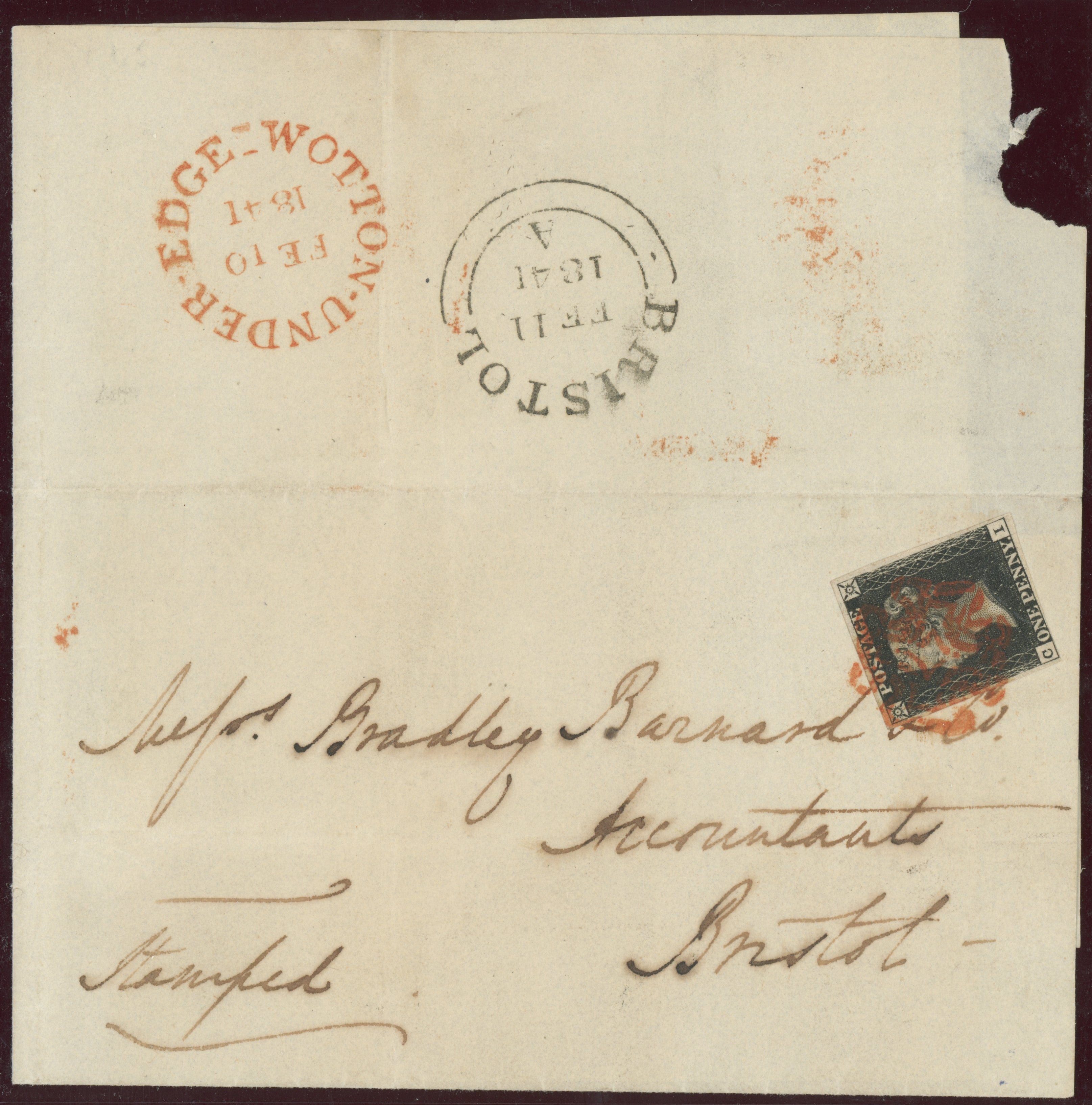 This attractive wrapper from Wotton-under-Edge to Bristol, dated February 10, 1841, is backstamped with matching Wotton-under-Edge and Bristol circular date stamps. Notably, this is believed to be the last recorded use of the red Wotton-under-Edge Maltese Cross, making it an important and well-documented philatelic item.