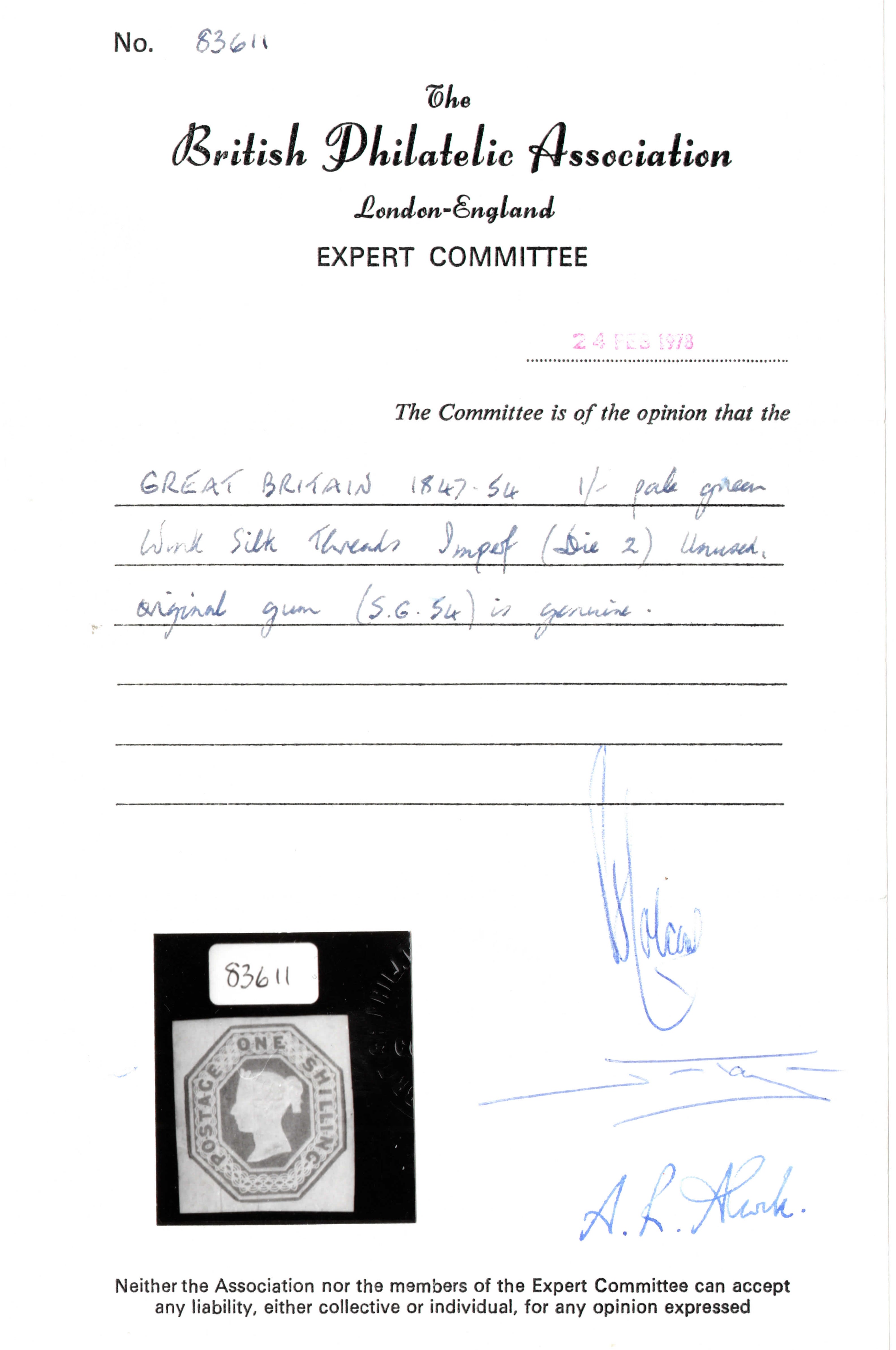 Great Britain 1847 1s pale green, on Dickinson silk thread paper, (Embossed Die II), SG54.