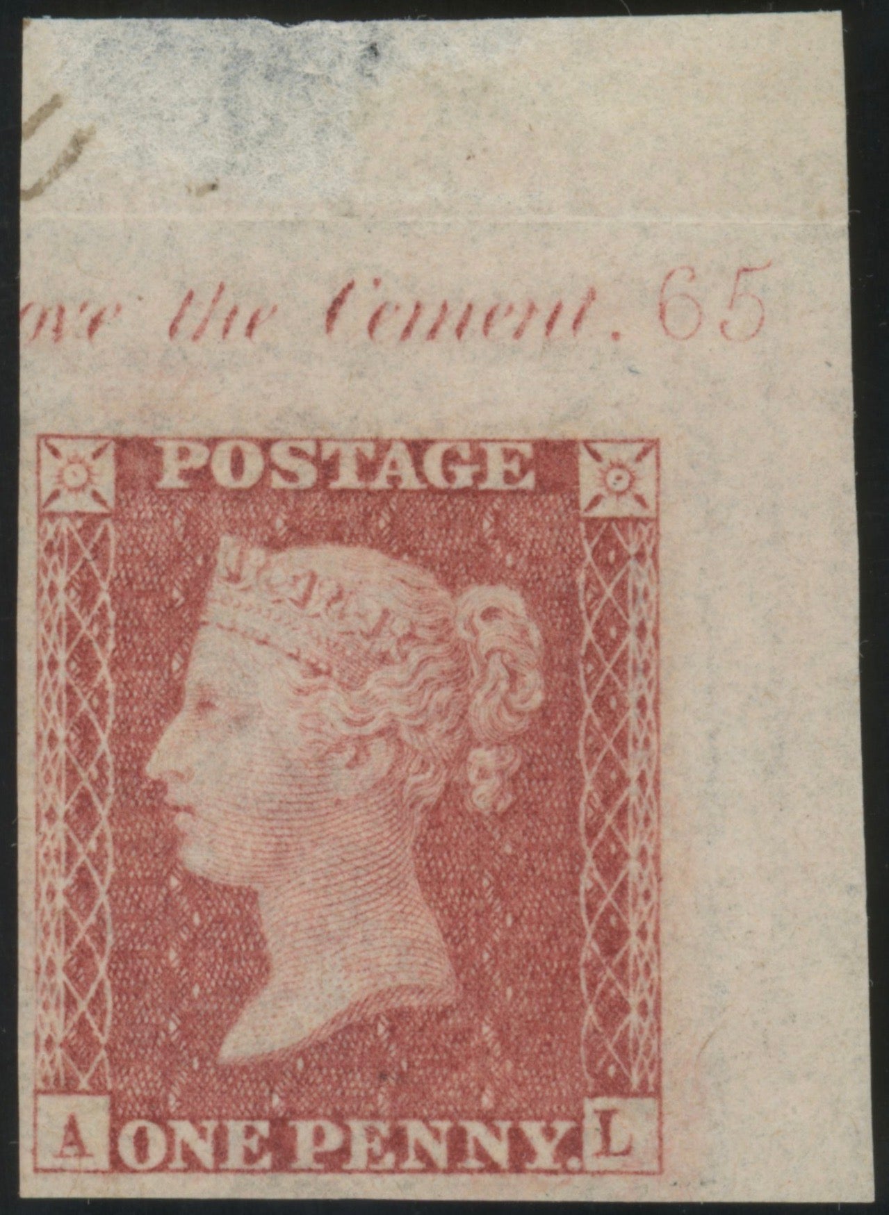 A superb large four margin imperforate corner marginal imprimatur, from the very first approved printing sheet, lettered 'AL', showing part sheet inscription and plate number "65".