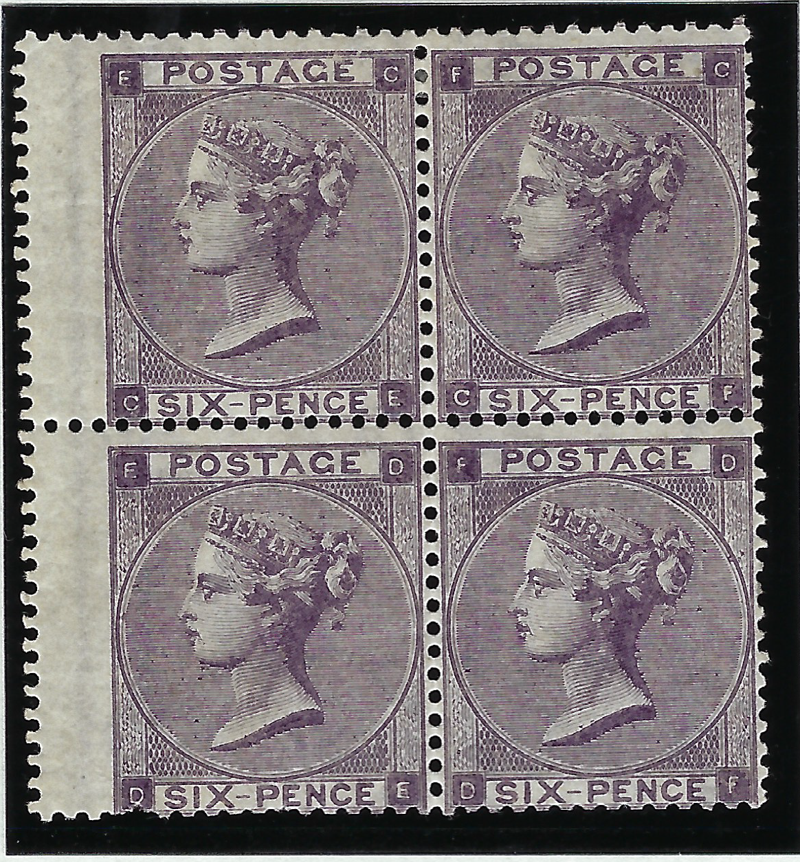 A very fine unused large part original gum left hand wing margin block of 4 lettered CE-DF. Some slight perforation faults at foot of DE, nevertheless a spectacular multiple with lovely intense colour.
