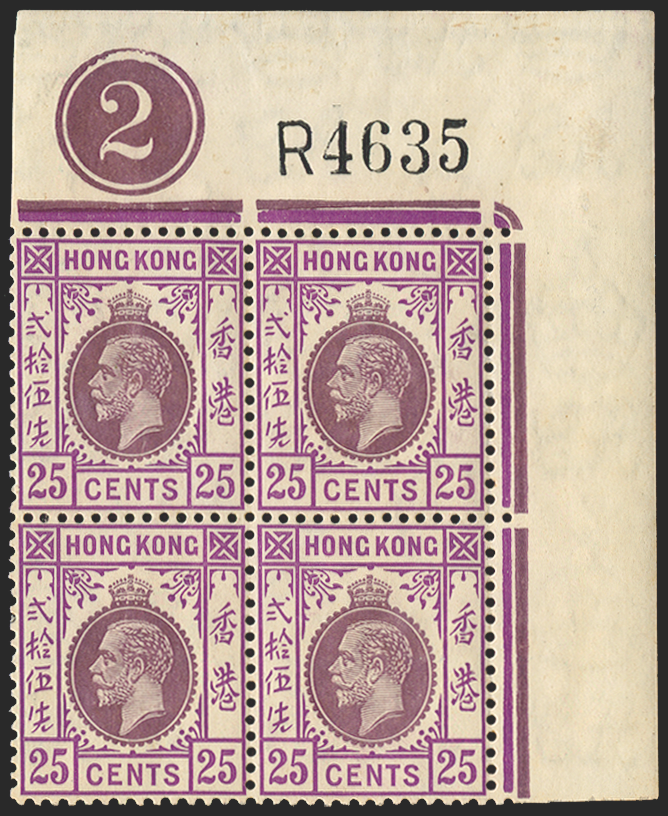 Hong Kong 1921-37 25c purple and magenta, Script watermark, upper right corner block of 4 showing plate number '2' and 'R4635' requisition number, 1937 printing, SG126.