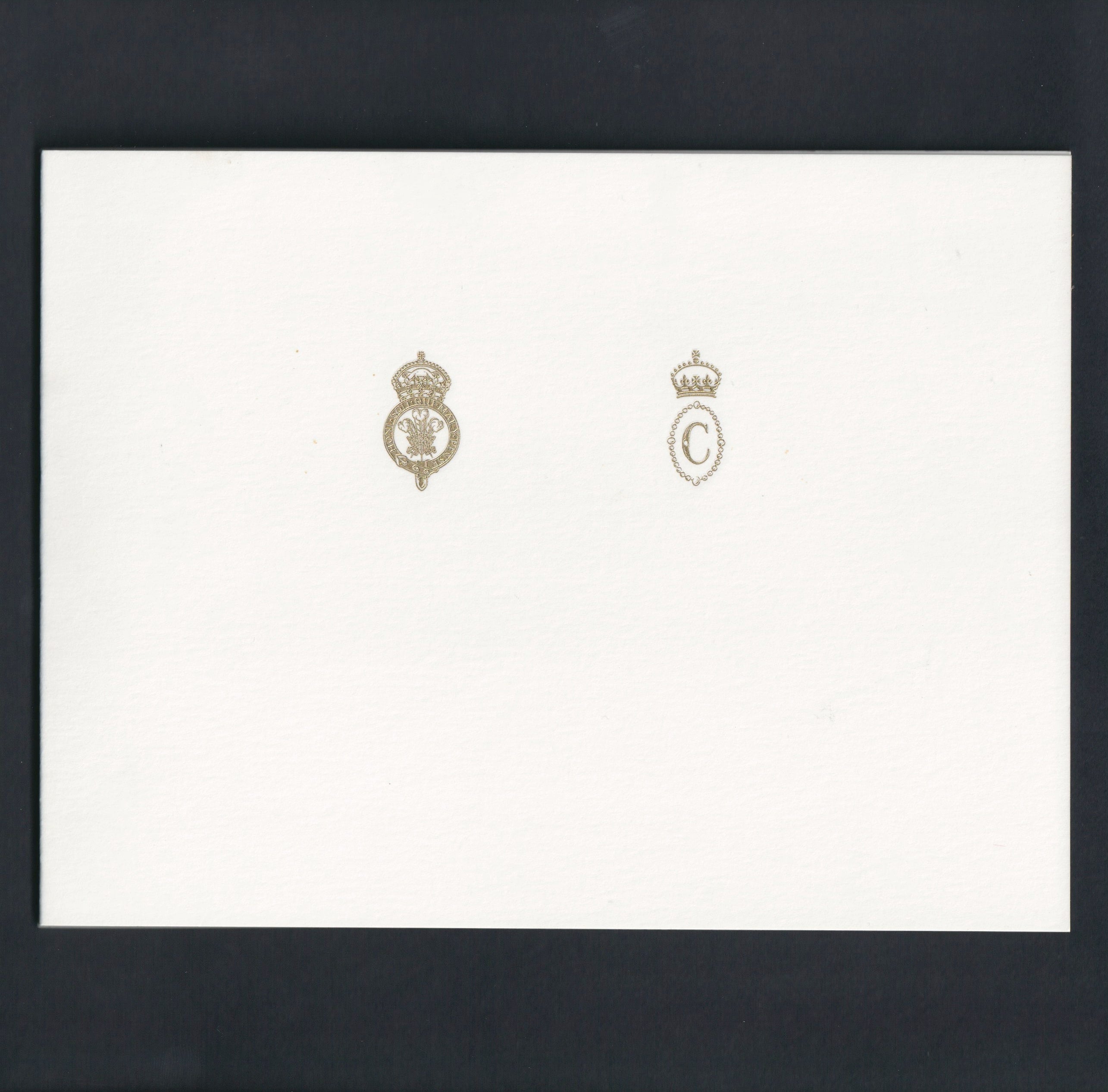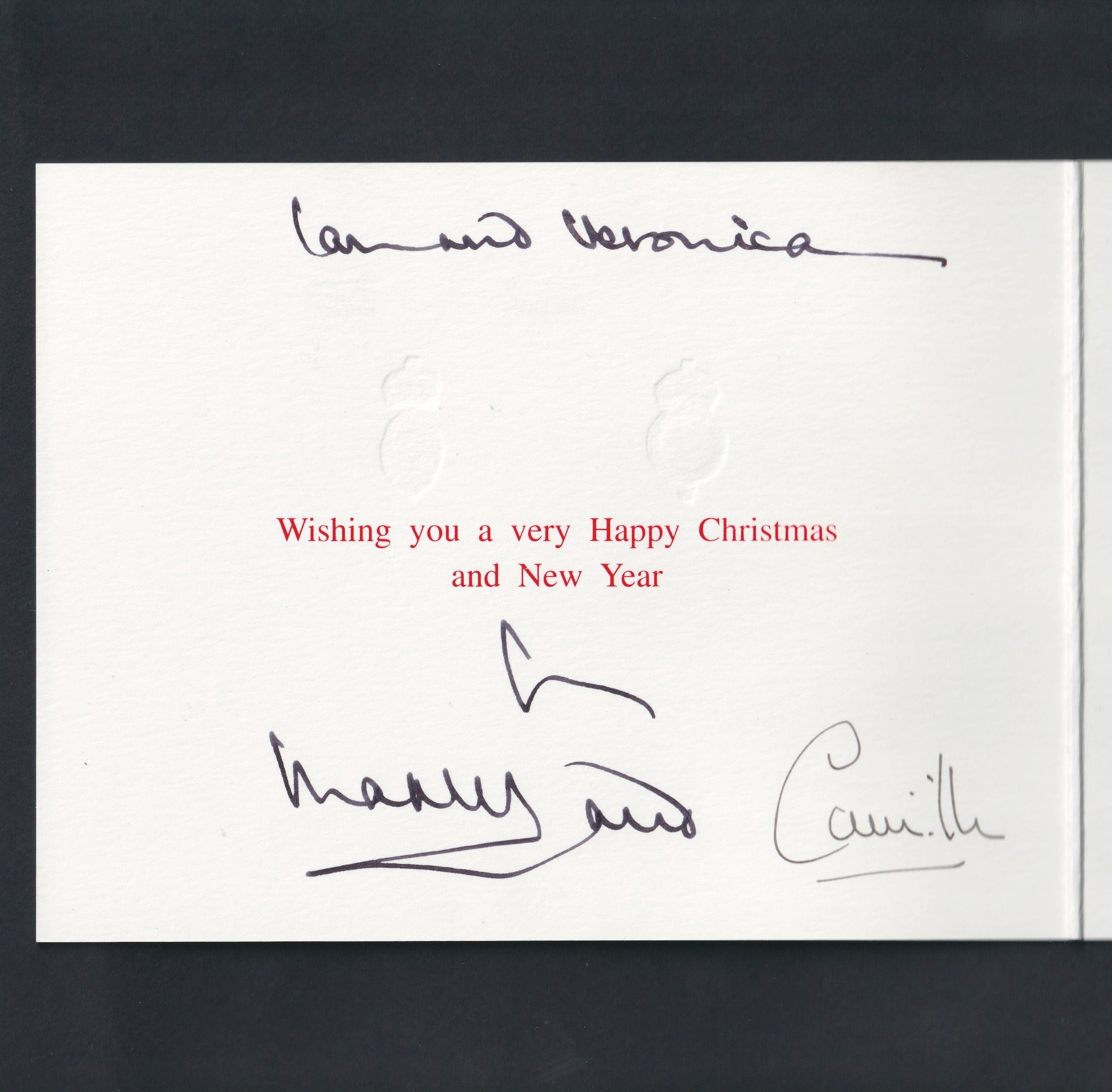 Inscribed to Ian and Veronica by hand, followed by printed greeting (“Wishing you a very Happy Christmas and New Year”) over strong, clear signatures by Charles and Camilla in different pens.