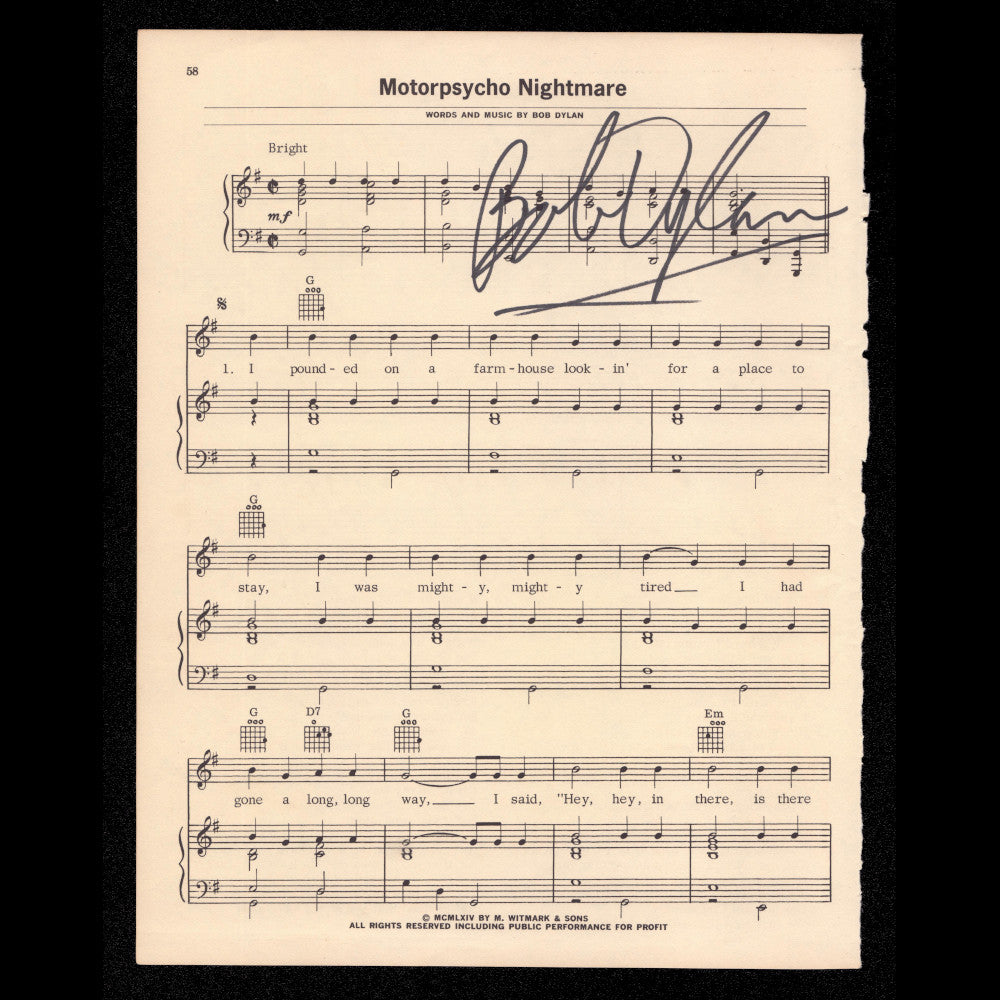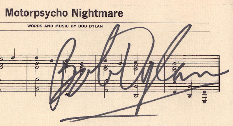 - A Bob Dylan signed page of sheet music for his 1964 song 'Motorpsycho Nightmare'.