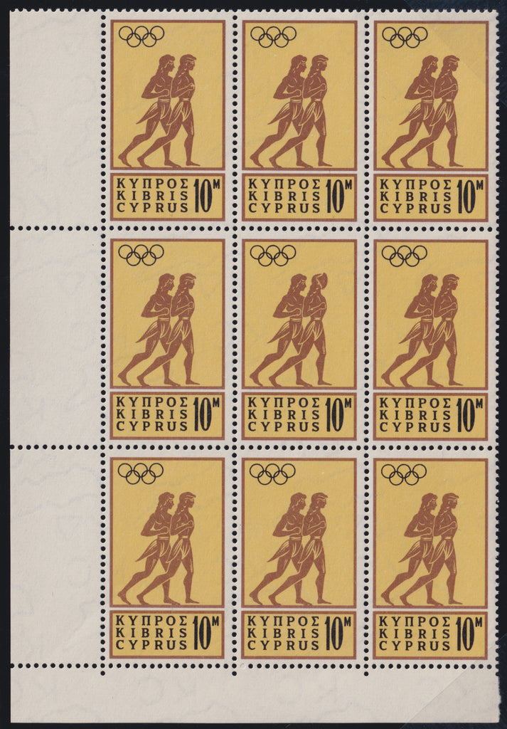 Cyprus 1964 Olympic Games 10m brown, black and yellow, lower left corner block of 9 (3x3), with watermark inverted, R9/2 showing 'Blind runner' printing flaw, SG246/a.
