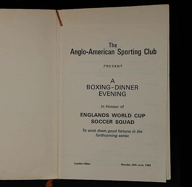 An Anglo-American Sporting Club boxing dinner evening menu signed handsomely by the 1966 England World Cup football team at the London Hilton on June 20, 1966.