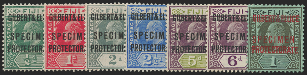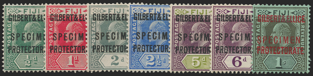 Gilbert and Ellice Islands 1911 set of 7 to 1s, type 1 overprint on Fiji, overprinted 'SPECIMEN', the 1s value exceptionally showing variety Broken 'M' (pos.41 of the setting), SG1s/7s.