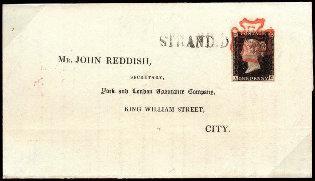A very fine cover bearing a four margin 1d intense black, plate 1a, lettered "AC", neatly tied by a crisp strike of a deep-orange Maltese Cross used on 25th May 1840.